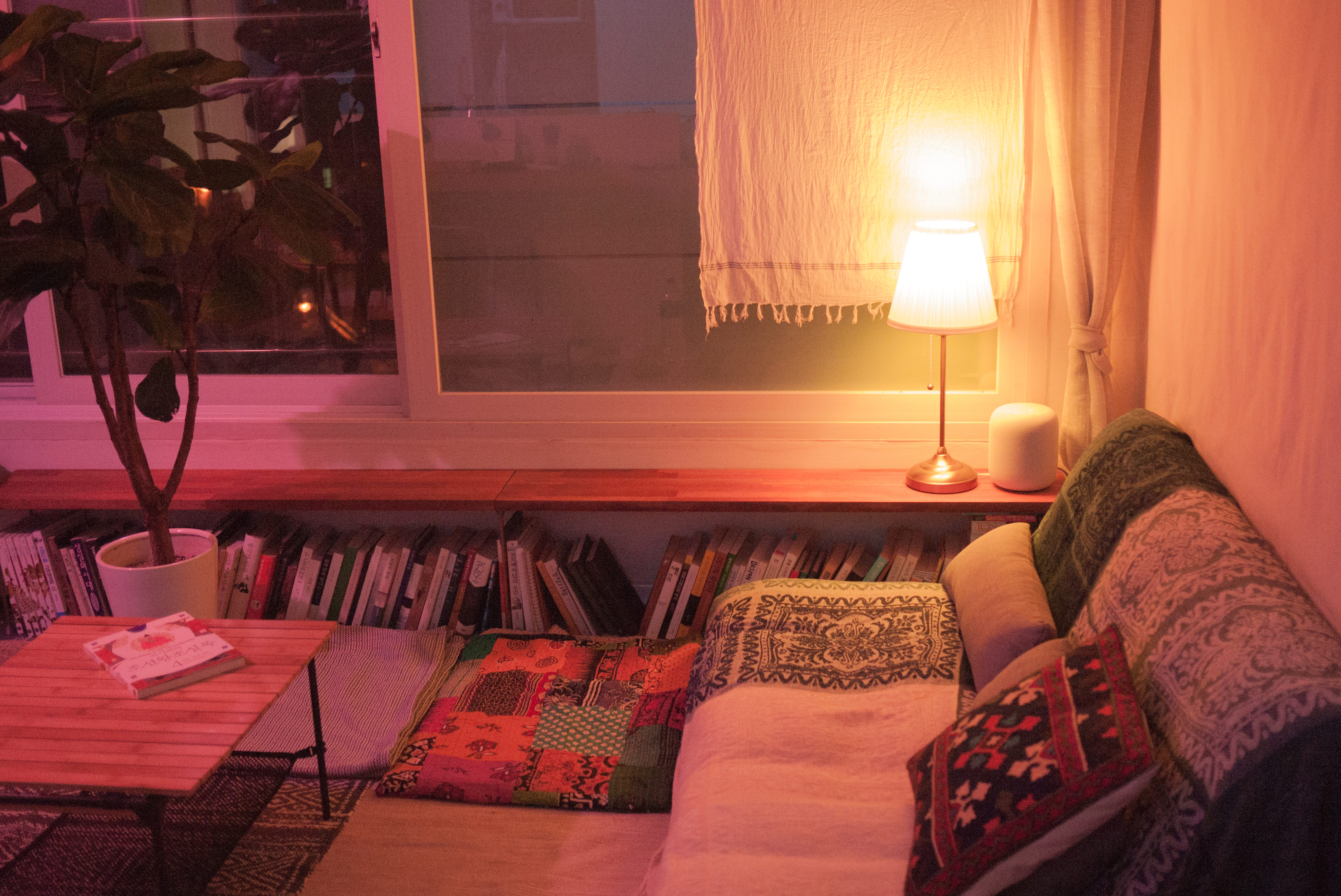 처음으로 집안 공간의 중심을 컴퓨터가 없게 꾸며봤습니다. 작은 거실에 낮은 소파와 작은 테이블, 책들을 놓기로 했어요. 책을 놓기 위해 벽 한쪽에 긴 책 선반을 만들기로 했고, 먼저 멀바우 집성목 판재를 샀습니다. 그리고 다리 대신 책을 옆으로 쌓아서 다리 역할을 하게 했죠. 일단 전반적인 분위기는 마음에 들었고, 본격적으로 다리를 만들기로 했습니다.