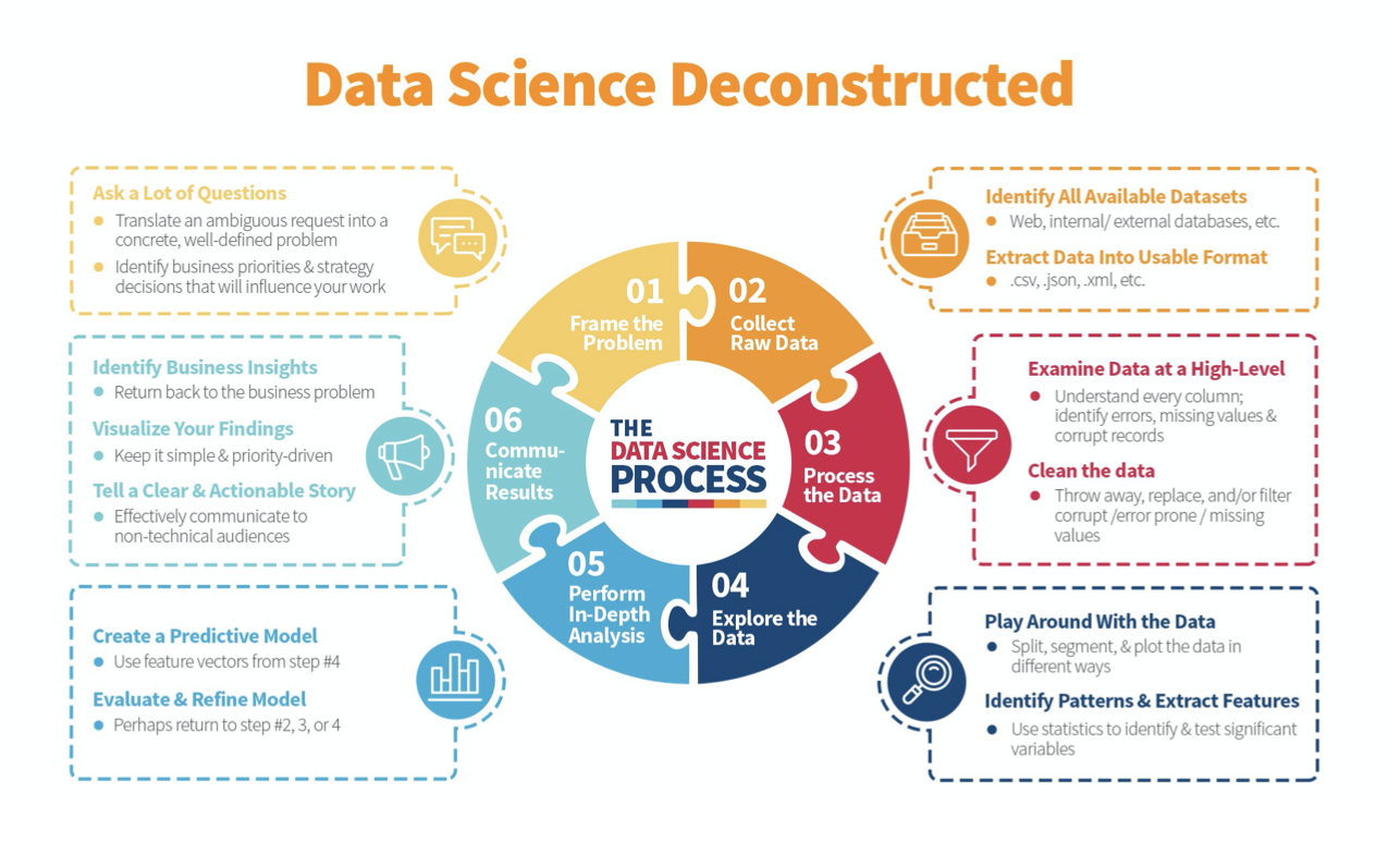 그렇다면, 우리는 데이터 사이언스의 과정에서 단계마다 어떤 접근을 해야 할까요? 각 과정에서 필요한 액션은 아래와 같이 설명될 수 있습니다.