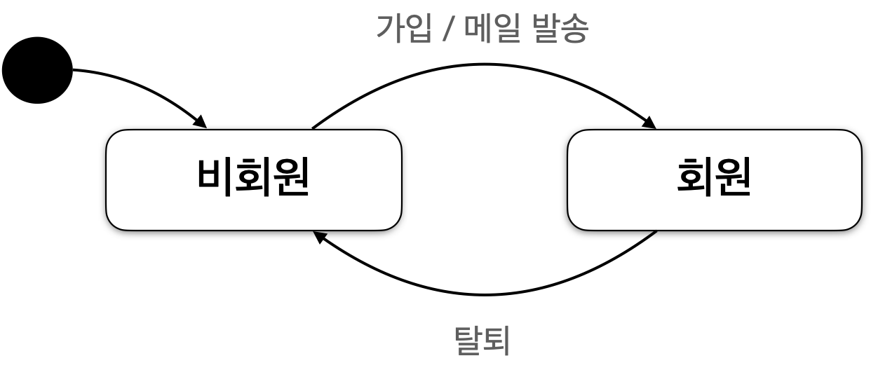 위 그림에서 네모 상자들은 각각 상태를 나타낸다. 하나의 네모 상자에서 다른 네모 상자로 향하는 화살표는 상태 전이를 나타낸다. 화살표 위에 "메일 발송"이라고 써 있는데 "가입"은 사건을 뜻하고 "메일 발송"은 해당 상태 전이에서 시스템이 수행하는 액션을 뜻한다. 작은 동그라미는 시작 상태이다. 시작 상태에서 "비회원"으로 향하는 화살표가 있으므로, 이 시스템에서 유저의 초기 상태는 "비회원"임을 알 수 있다.