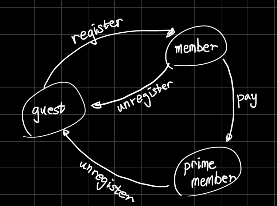 어떤 인터넷 서비스가 있다. 이 서비스에 가입하지 않은 사람은 "비회원"이다. 가입을 하면 "회원"이 된다. 탈퇴를 하면 다시 "비회원"이 된다. 이 간단한 멤버십은 이렇게 정리할 수 있다.