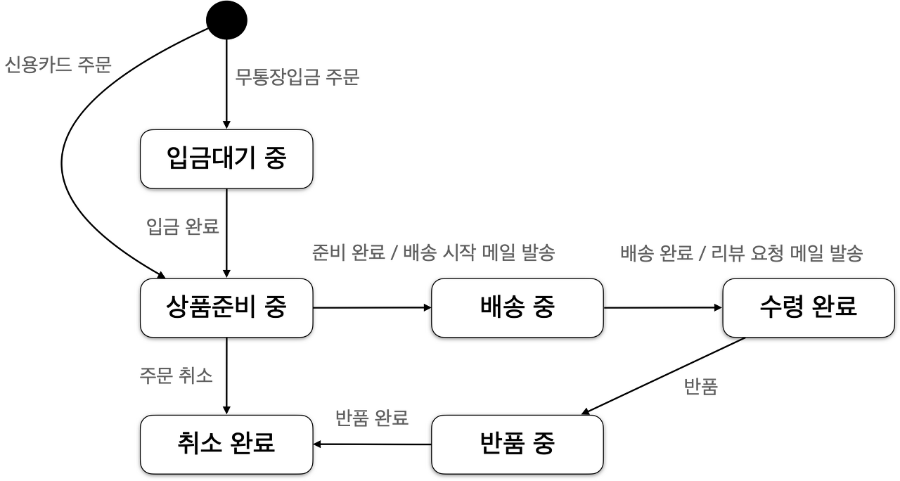 위와 같이 단순한 기획은 굳이 상태 전이 관점에서 살펴보아도 큰 장점이 없다. 이번에는 쇼핑몰의 주문-배송-수령 단계를 상태 전이 관점에서 나타내보자.