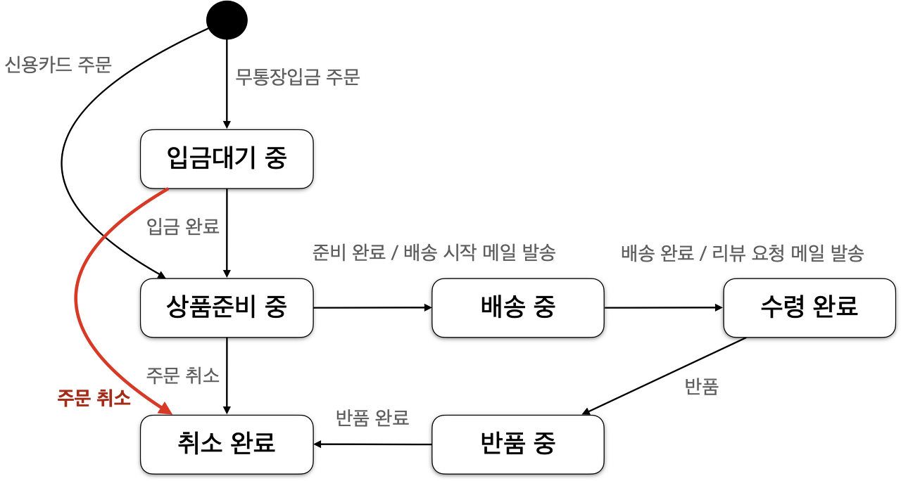 예를 들면, 위 표를 채우는 과정에서 자연스럽게 "입금대기 중 상태에서 주문 취소를 하면 어떻게 처리해야 하는지" 고려할 필요가 있음을 발견하게 된다. 그 결과 아래와 같이 새로운 상태 전이를 추가할 수 있게 된다.