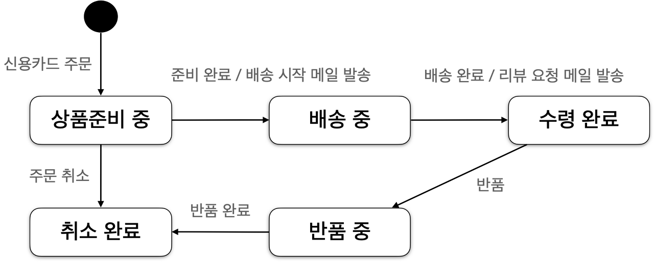 - "배송 중" 상태에서 발생할 수 있는 유일한 사건이 "배송 완료"라는 점을 통해, 배송 중엔 "주문 취소"를 하거나 "반품"을 할 수 없다는 점을 명확히 파악할 수 있다. 현재 시스템에 배송 중 변심한 경우 고객이 할 수 있는 일은 수령한 후 반품을 하는 것 뿐이다.