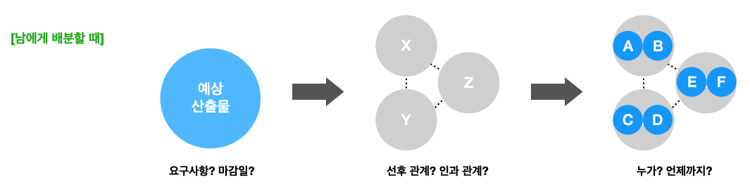 이외에 논의를 하면서 결정하는 업무라면 어떤 사람들을 같이 붙여서 한 덩어리를 완성하도록 요청해야 할지 생각해봅니다. 아니면 전체 논의를 하고 각자 나눠가지면 되는 업무일 수도 있고요. 혼자 하는 게 더 효율적인 업무일지 판단해야 합니다.