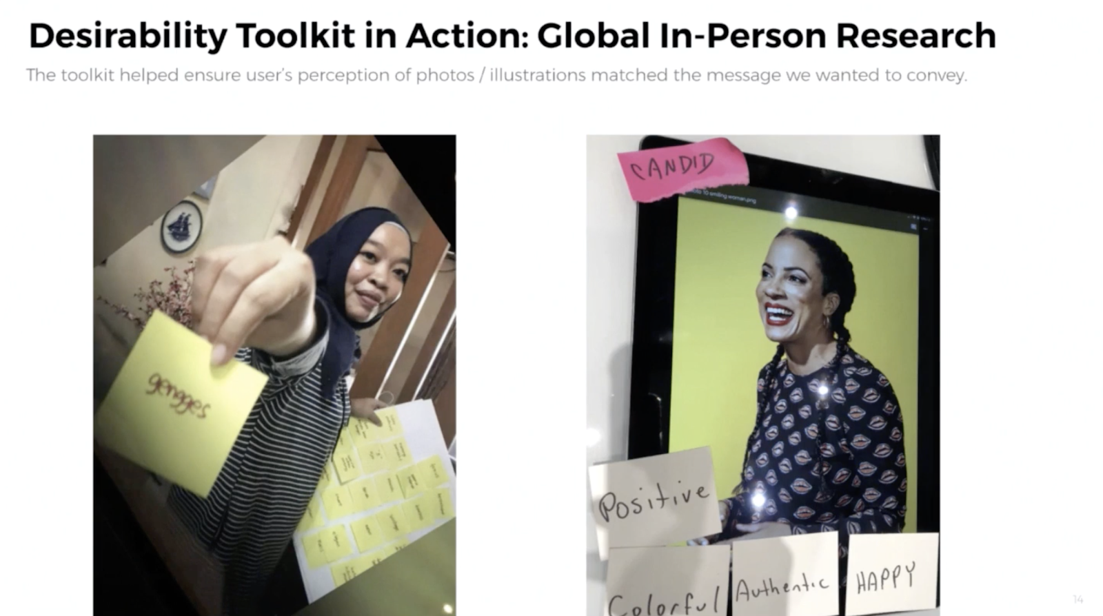 이 툴킷은 각 나라 및 지역의 특성을 가진 단어로 번역되어, 브라질, 인도네시아 등 글로벌 리서치를 통해 페이스북의 시각 언어를 측정하는데 활용되고 있습니다.