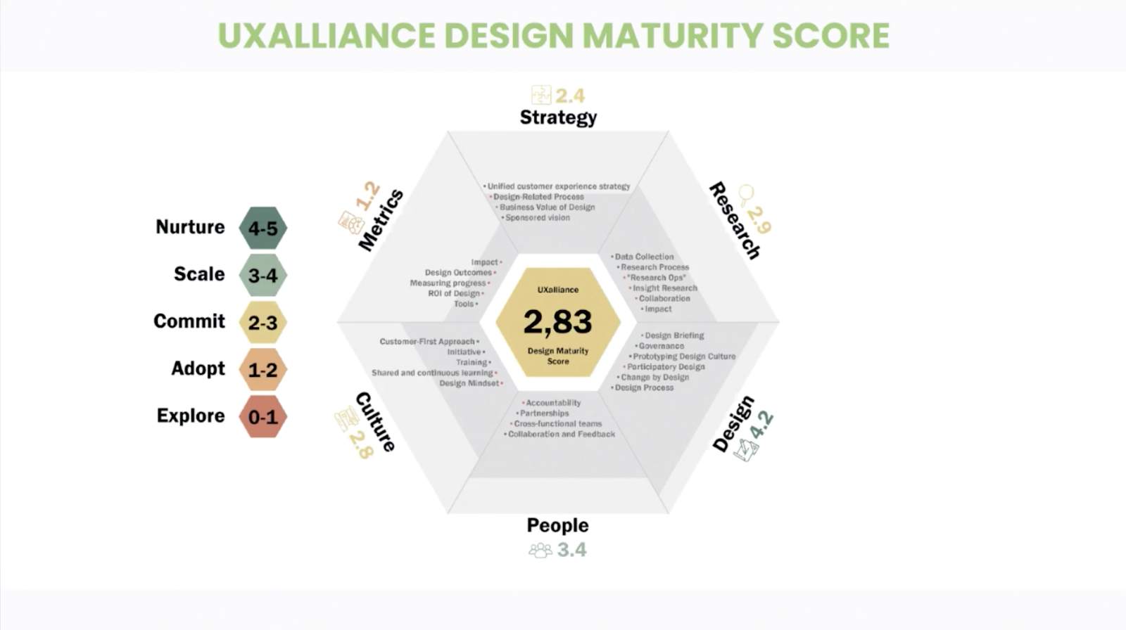 UX 얼라이언스의 디자인 성숙도는 리서치, 디자인, 사람, 문화, 척도, 전략으로 이루어져 있습니다. 이 여섯 가지의 가치가 조직 내에서 어떻게 다루어지는지를 파악하고 방향을 제시하는 기준으로 삼을 수 있습니다.