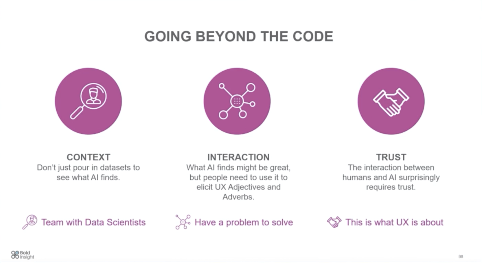 Gavin은 AI가 성공하기위한 핵심 요소에 대해 논의합니다. 의료, 금융 및 소비자 제품의 예를 통해 AI가 미래의 성공을 거둘 수있는 길을 열어주는 UX 프레임 워크를 “맥락, 인터랙션, 신뢰” 3가지 관점에서 설명합니다.