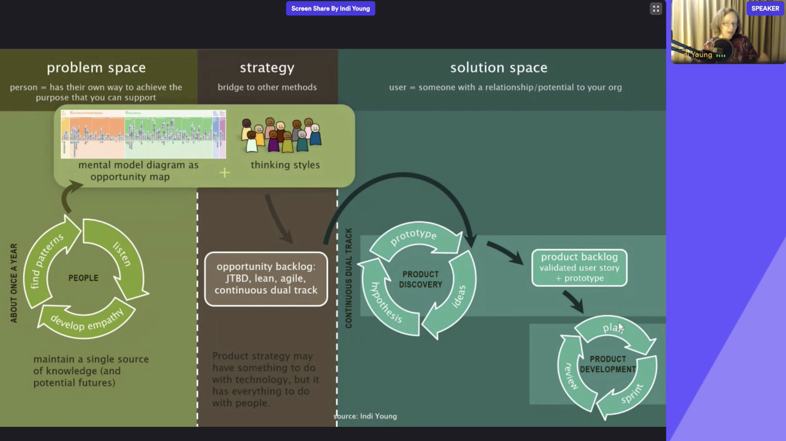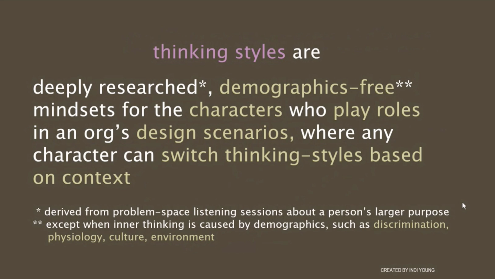 인디 영은 사용자에 대한 전형(archetype)을 제안하는 퍼소나 대신 ‘사고 방법(thinking style)을 제안합니다.