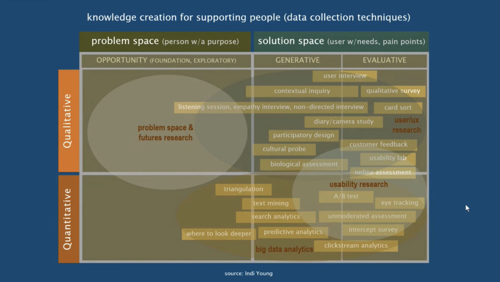 인디 영은 이를 “Problem space - Strategy - Solution space”라는 새로운 프레임으로 제시하고 있습니다. 또 이 프레임을 가진 리서치 방법을 “Problem space & future research” 라고 부릅니다. 이 방법은 이미 존재하는 행동을 파악하고 개선하기 위핸 연구 영역인 generative, evaluative 연구 영역을 넘어, 기회를 발견하기 위한 탐색적 리서치 방법으로 이해할 수 있습니다.