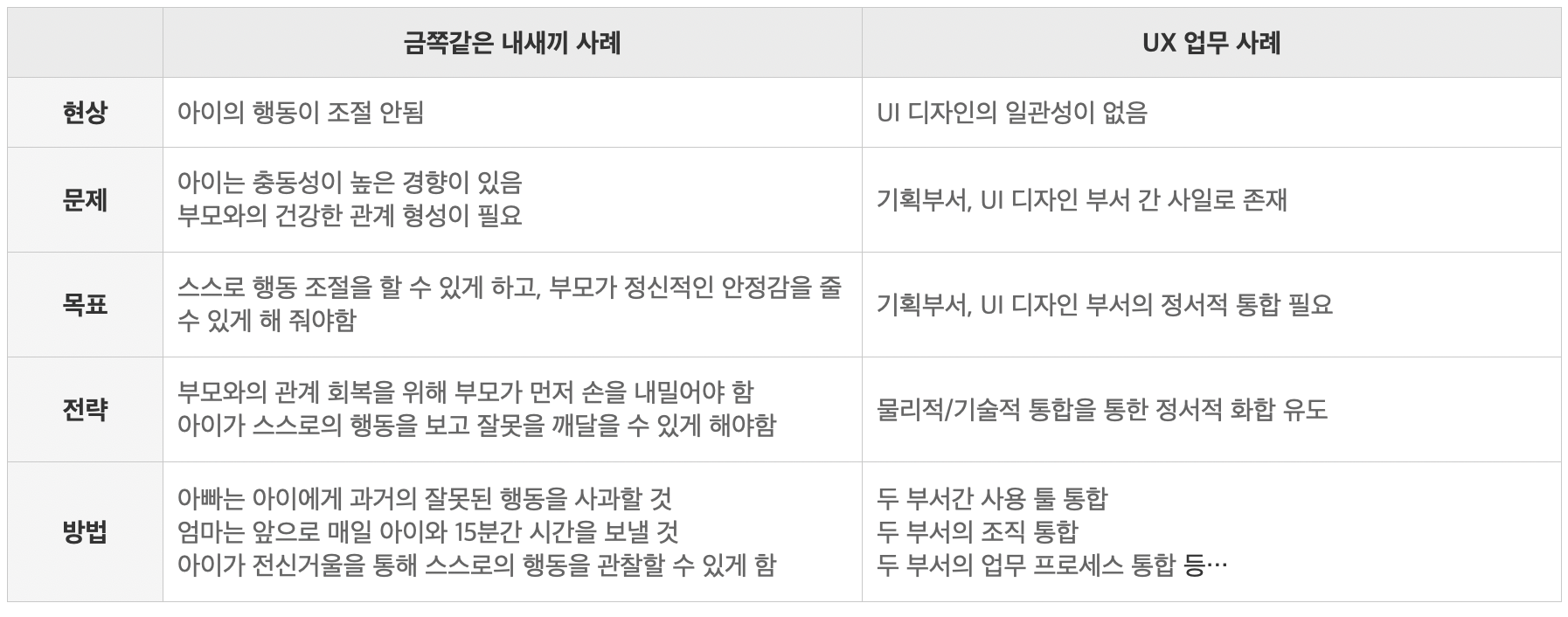 기업에서 ‘UI디자인의 일관성이 떨어져요’라고 했을 때, 이는 문제가 아닌 현상이라고 지칭해야 합니다. 일관성이 떨어지게 된 배경을 파악하여 진짜 문제를 수면 위에 올려야 합니다. UI의 일관성 부재라는 현상이 일어나게 된 배경에는 조직의 사일로라는 하이 레벨의 문제에서부터, 디자이너 한 명의 반복되는 실수라는 리소스 문제, 디자인 시스템의 부재라는 자원 관리 문제 등 다양한 문제가 있을 수 있습니다. 진짜 문제는 조직의 사일로인데 디자인 시스템을 만드는 것으로 문제를 해결하려고 하면 제대로 된 해결이 아닐 겁니다. 마치 아이가 자주 떼쓰기 때문에 아이가 지나는 동선에 사탕을 배치하라는 해결과 유사합니다.