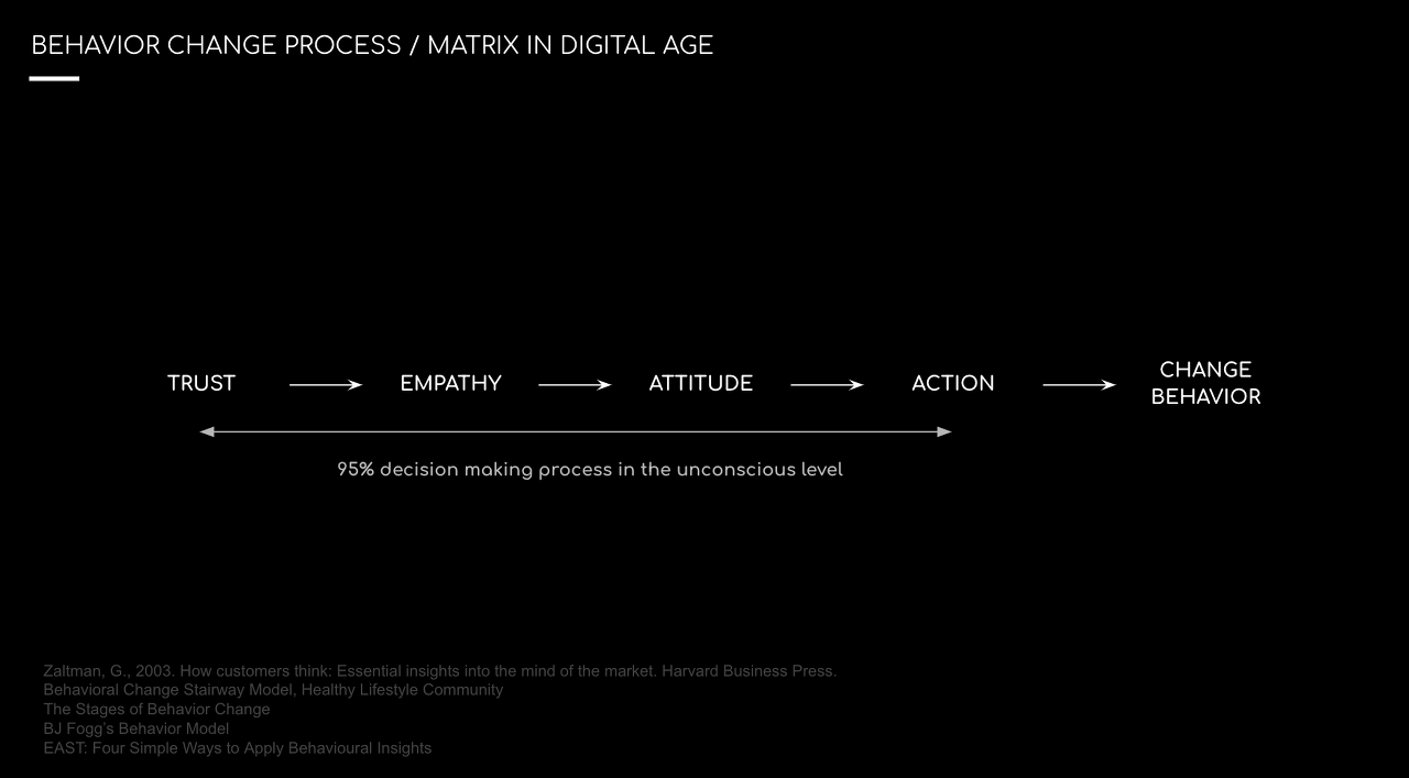 오늘날 많은 서비스들이 고객 그러니까 사람을 중심으로 이루어짐에 따라, 디자이너가 사람을 설득하기도 행동동을 만드는 것을 넘어 습관을 형성하기도 합니다. 사람들의 행동은 쉽게 만들어지지는 않습니다. 새로운 정보를 입력받았을 때 그에 대한 신뢰성, 공감, 정신적 자세를 통해 액션을 취하게 됩니다. 이는 무의식적으로 만들어지는 경우가 많으며 액션을 취했다고 하더라도 이것이 행동이 되려면 여러 번의 반복이 필요합니다. 따라서 액션을 만드는 트리거의 반복적인 주입이 디지털 시대에 행동을 만드는 중요한 요소라고 생각합니다.