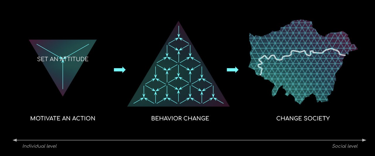 사회 물리학은 빅데이터와 디지털 기술을 사용하여 패턴을 확인하고, 사회적 상호작용의 결과를 예측하는 새로운 과학분야로 SNS 서비스가 많아짐에 따라 사람들이 모이면서 서로에게 영향을 주고받으며, 활발한 커뮤니케이션을 통해 사회적 학습이 생겨난다는 것에 대해서 이야기합니다(이는 집단지성, Collective Intelligence와 맥을 같이합니다). 사회 물리학 자체는 다른 목적을 위해 시작되었지만 디지털 공간에서의 사회적 상호작용의 결과로 생긴 사회적 학습이 기존의 정보 전달로 행동을 만드는 방식(traditional behavior change)이 아닌 새로운 방식의 행동을 만드는 데에 아이디어를 줄 수 있기 때문에 도움이 될만한 분야입니다.