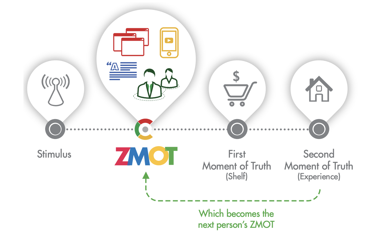 ZMOT는 구글이 말하는 오늘날 소비자들의 소비자들의 구매 행태를 정리한 것으로 기본적으로 MOT(Moment Of Truth)는 구매 순간인 (First MOT) 그리고 구매한 제품을 사용하는 순간인 SMOT(Second MOT)으로 나뉘고 구매 결정 이전 단계에 소비자가 여러 가지 채널을 통해 정보를 획득하여 구매 여부를 판단하게 되는 것을 의미합니다.