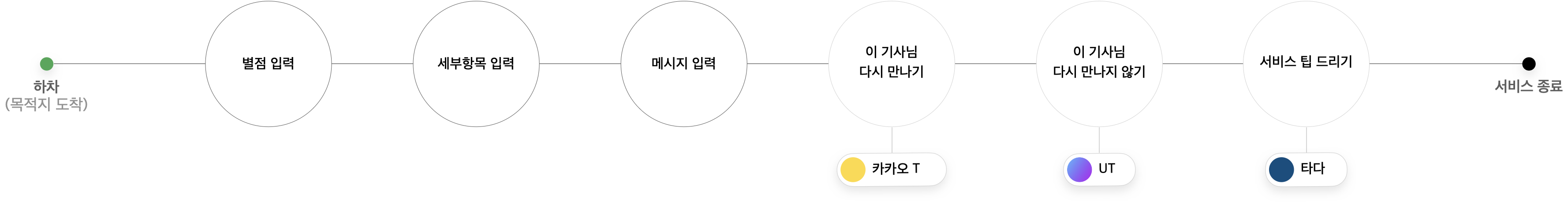 하차는**평가 및 결제의 과정으로 모든 앱이 별점과 세부 의견을 선택할 수 있으며 직접 메시지를 작성할 수 있습니다. 추가로 **타다는 마지막 단계에 팁을 제안합니다.