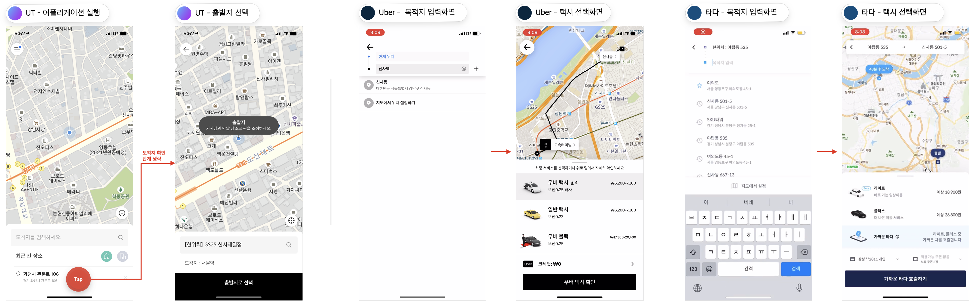 이러한 이유로 카카오 T와 UT 그리고 Uber와 타다는 서비스 차량의 수와 제공 가능한 서비스에서 차이를 보입니다. 특히 서비스 차량의 수는 호출 뒤 배차의 속도, 성공률, 범위에 영향을 미치기 때문에 해당 요소들은 제외하고 핵심 사용자 여정을 중심으로 4개의 택시 호출 앱을 비교 분석하였습니다.