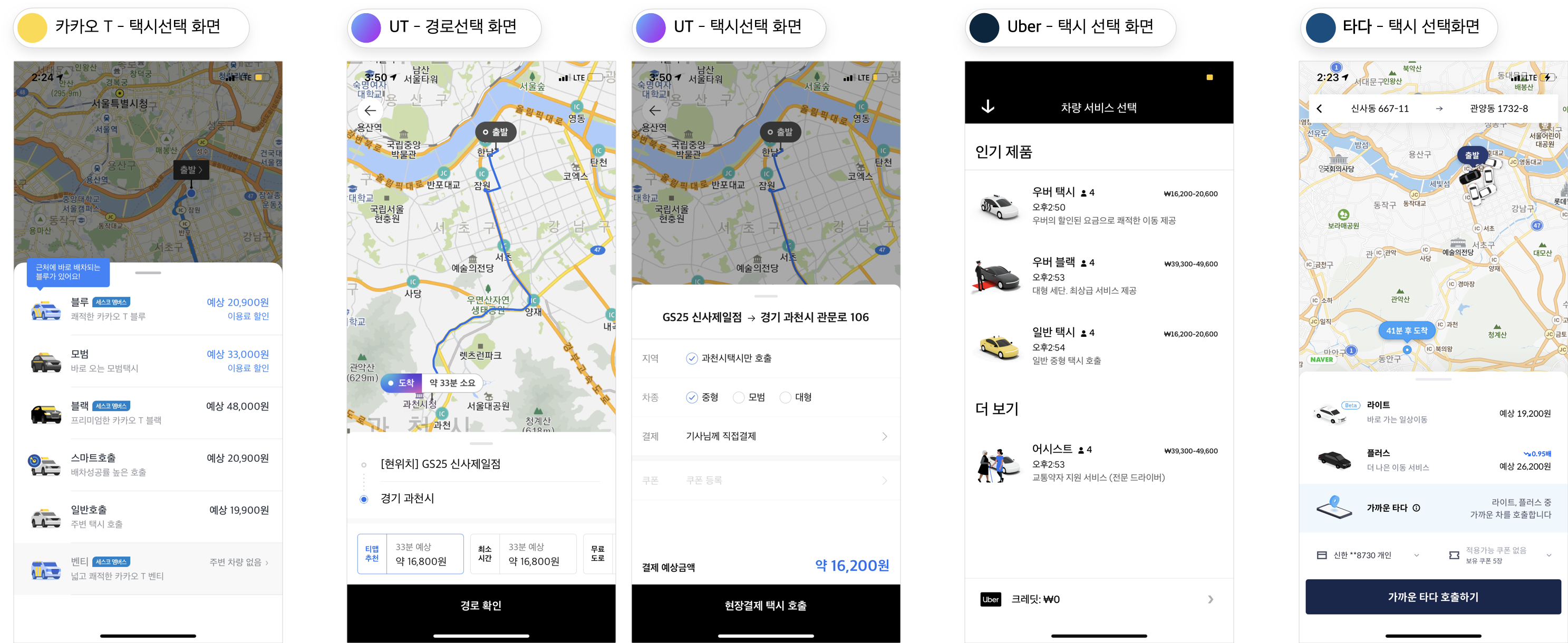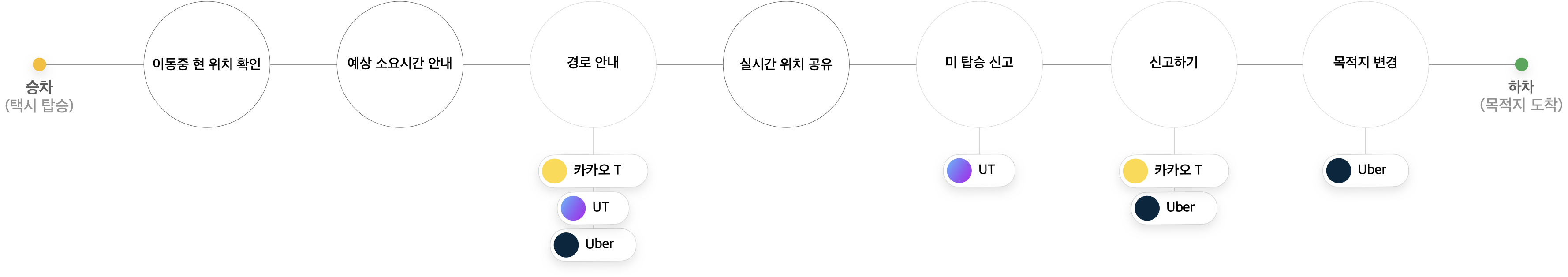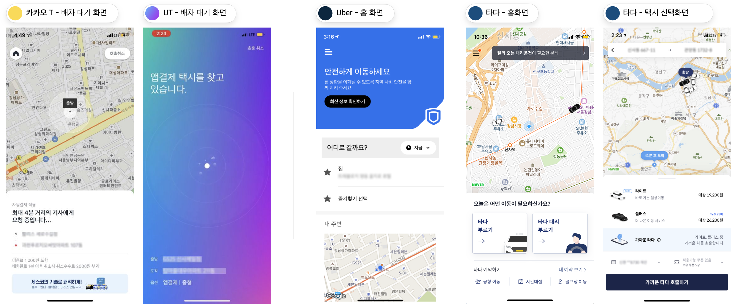 이러한 이유로 카카오 T와 UT 그리고 Uber와 타다는 서비스 차량의 수와 제공 가능한 서비스에서 차이를 보입니다. 특히 서비스 차량의 수는 호출 뒤 배차의 속도, 성공률, 범위에 영향을 미치기 때문에 해당 요소들은 제외하고 핵심 사용자 여정을 중심으로 4개의 택시 호출 앱을 비교 분석하였습니다.