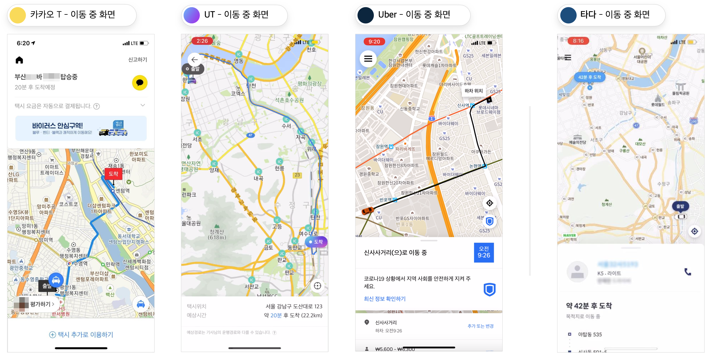 이동을 기점으로 사용자는 기사님과의 소통보다는 정보 확인을 목적으로 앱을 사용하는데요. 사용자에겐 자신이 어디쯤 왔는지, 그리고 언제쯤 도착하는지 중요하기 때문에 모든 앱이 지도를 중심으로 현 위치와 도착지를 안내하고 있습니다. 각 앱은 강조하고자 하는 기능에 따라 다른 UI를 제공하고 있는데요.