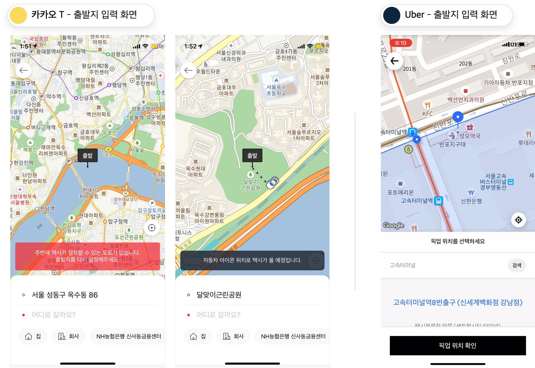 Uber와 타다는 탑승 위치를 현 위치로 자동 입력한 후 차종과 결제수단 입력 과정을 제공합니다. 이로 하여금 출발지를 수정할 수 있는지 확인이 어렵다는 단점이 있습니다.