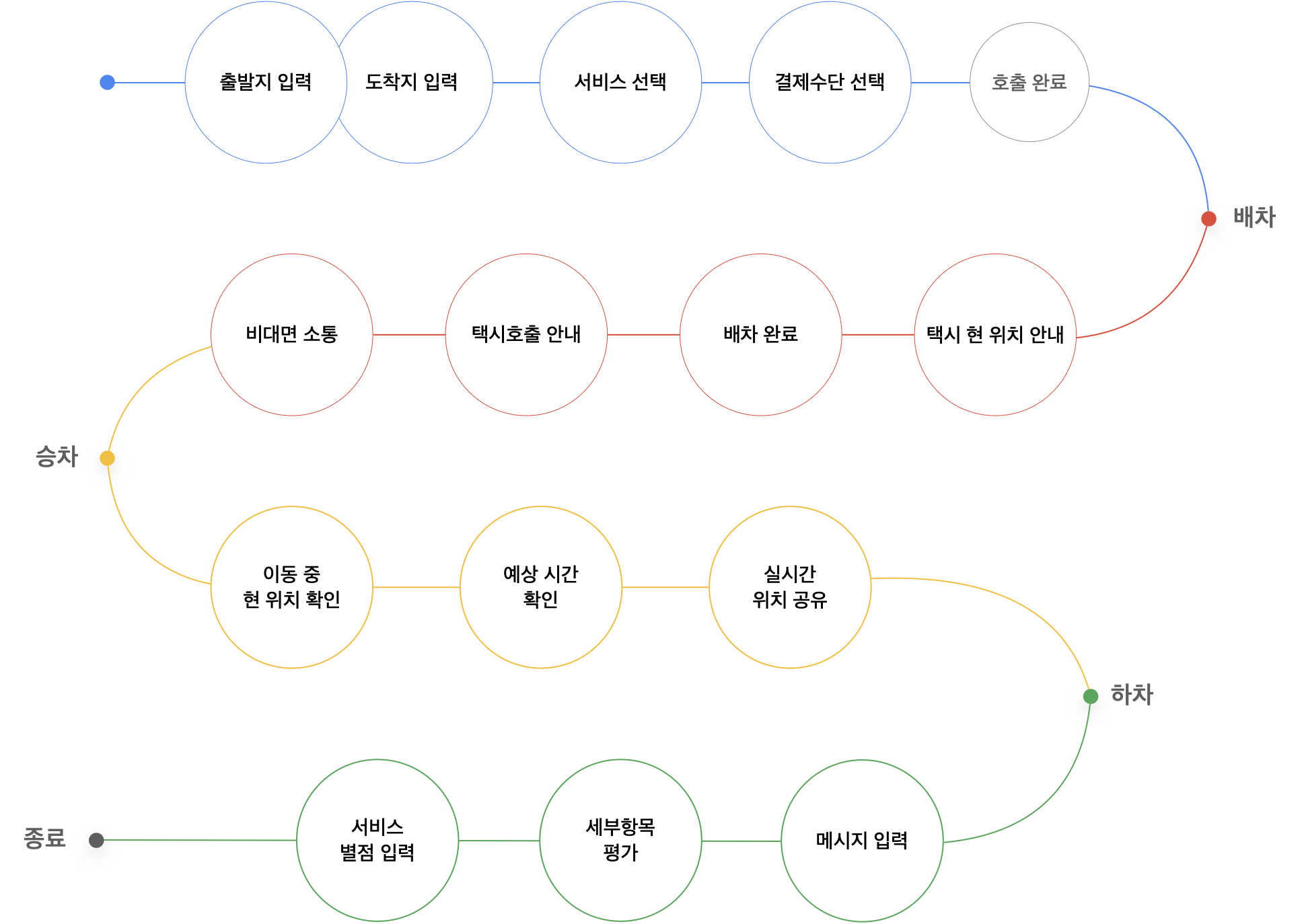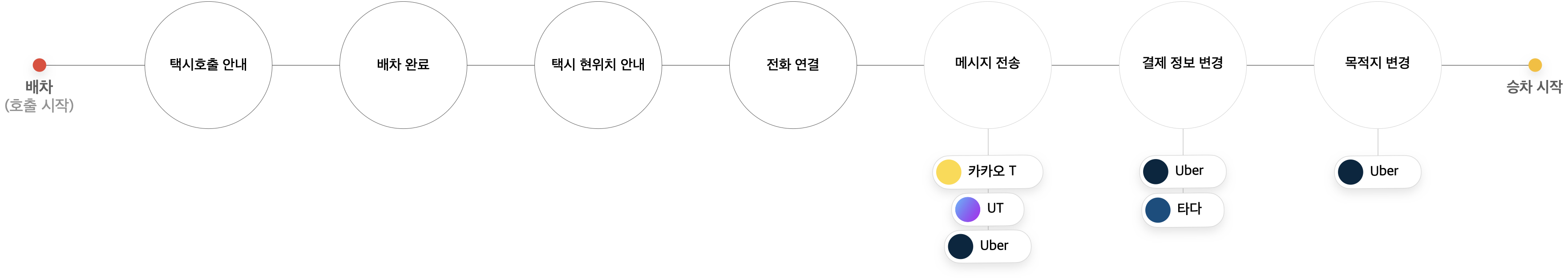 모든 앱에서 사용자는 [호출 → 배차 → 승차 → 하차]의 단계를 동일하게 거쳐야 합니다. 하지만, 각 서비스의 특성에 따라 이 여정 안에서 조금씩 차이를 보입니다. 아래에서 자세히 알아보겠습니다.