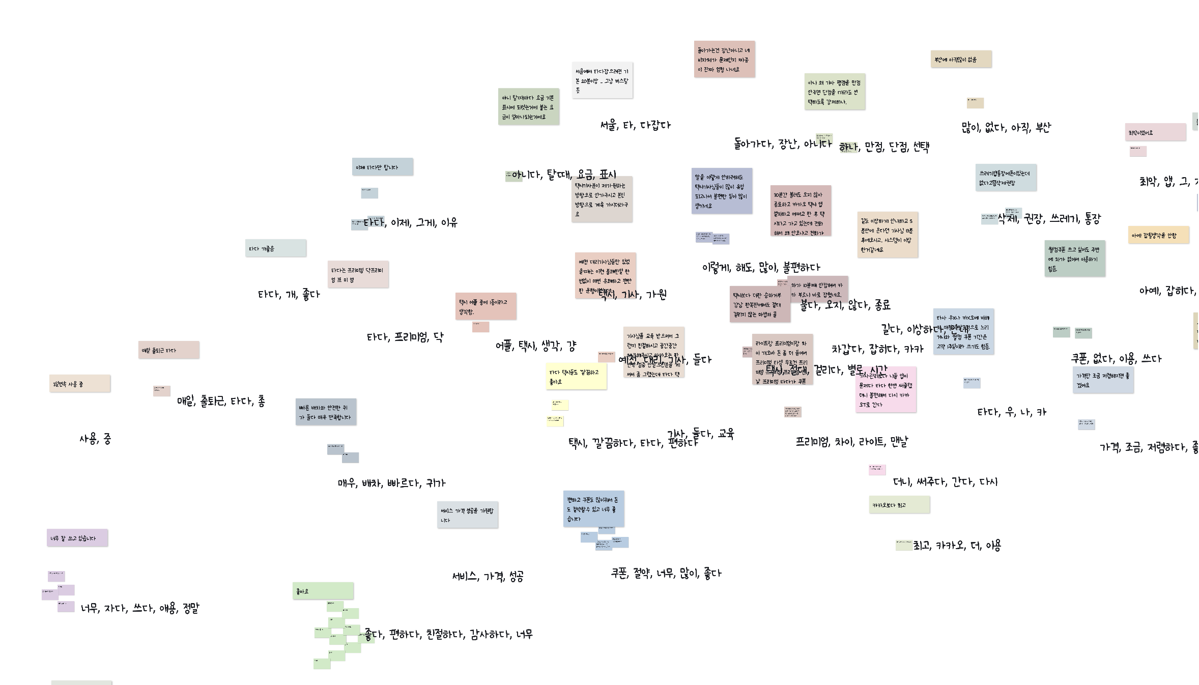 이외에도 분석과정에서 현재 pxd에서 개발 중인 다양한 분석 프로그램을 사용해볼 수 있었습니다. 해당 프로그램은 각 단어들의 관계를 표시하고 유사한 관계의 단어들을 묶어주는 프로그램입니다. 덕분에 보다 빠른 리뷰 분석이 가능했습니다.
