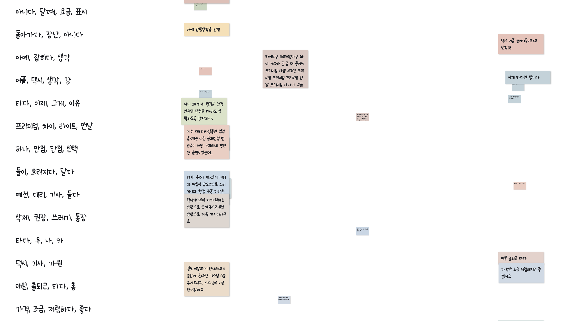 이번 리서치를 진행하기에 앞서 저는 "택시 호출 앱에서 중요한 경험은 '정확성'일 것이다."라고 가정했습니다. 때문에 사용자 의견 또한 '탑승 및 하차 위치 입력', '예상 소요시간 안내'와 같은 정보를 전달하는 과정에 집중될 것이라고 예상했습니다. 하지만 리서치 진행과정에서 탑승 전 기사님께 의견을 전달할 수 있는 기능이 다양하다는 점을 확인할 수 있었고 사용자 의견을 수집한 결과 '더 다양한 메시지를 전달하고 싶다.' 혹은, '전달한 메시지를 읽었는지 확인할 수 없다.'와 같이 전반적으로 '소통'에 서비스와 사용자 의견이 집중되는 것을 확인할 수 있었습니다.