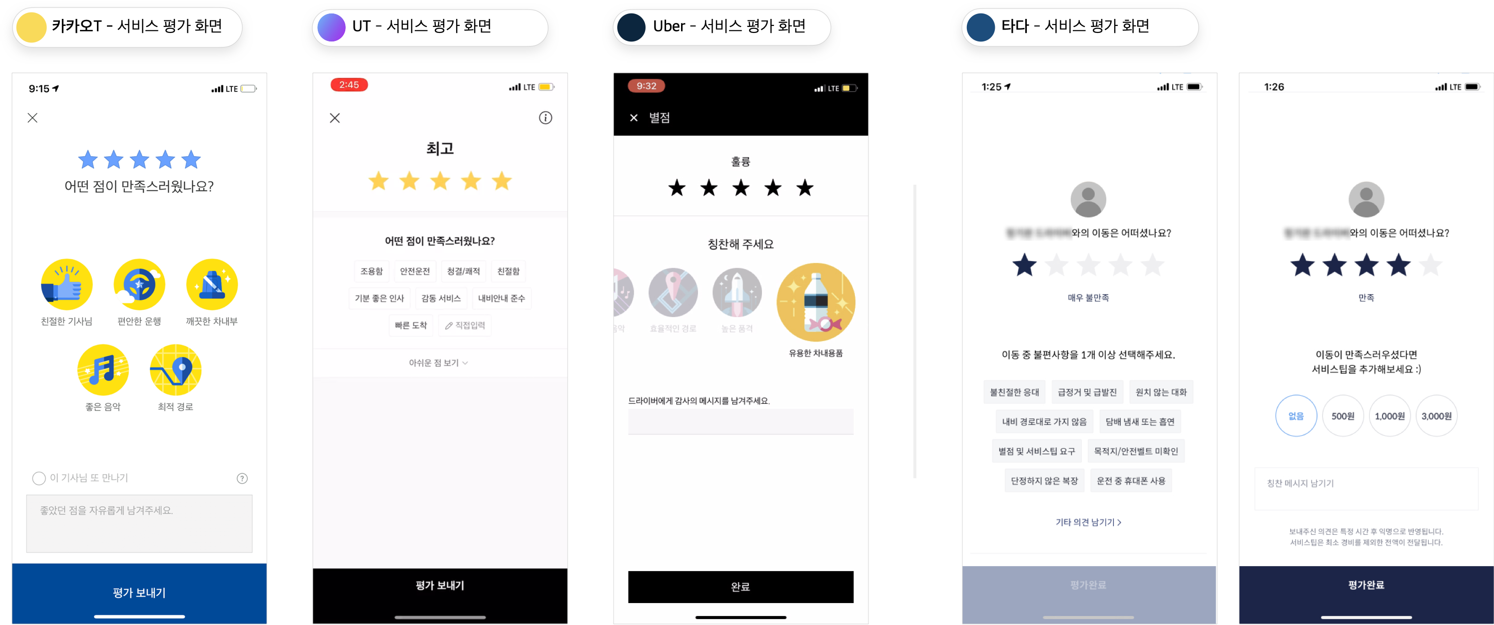 택시 호출 서비스의 사용자 경험은 각 택시의 환경, 기사님의 태도, 운전 방식 등 다양한 요소의 영향을 받기 때문에 앱에서 이에 대한 사용자의 의견을 수집하는 것 또한 중요합니다. 이에 모든 서비스는 하차 후 별점을 입력한 후 세부항목 선택과 메시지를 전달할 수 있는 기능을 제공하고 있습니다. 하자만 이후 탑승 경험에 반영되는 내용은 앱별로 차이를 보입니다.