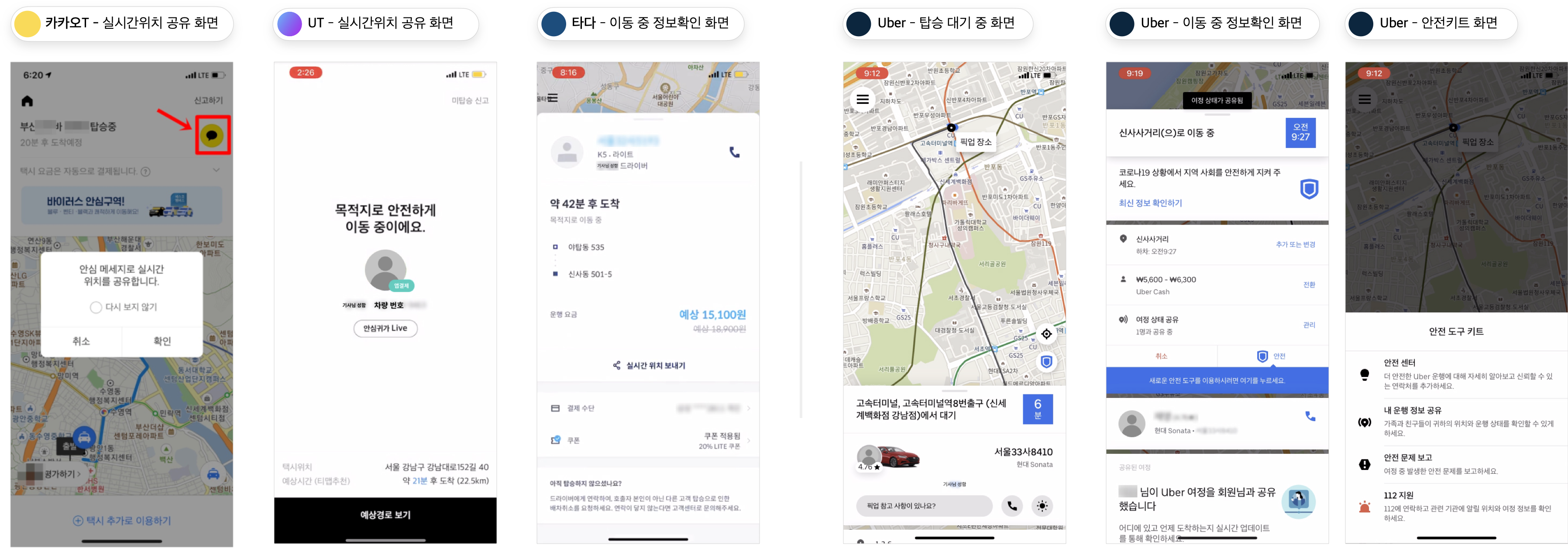 늦은 밤 귀가하거나 혼자 택시에 탑승할 때 사용자가 느끼는 불안요소를 완화하기 위해 네 가지 앱 모두 필수적으로 실시간 위치 공유 기능을 제공하고 있습니다.
