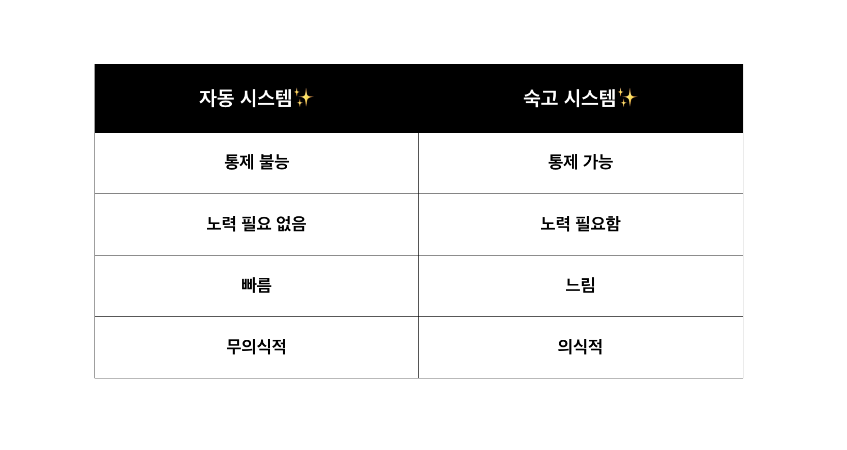 인간은 위 그림과 같이 크게 두 가지 방법으로 인지 과정을 밟습니다. 자동 시스템(휴리스틱)과 숙고 시스템인데요, 여기서 자동 시스템은 위에서 언급한 ‘생명 유지의 뇌’ 영역에 처리합니다. 놀랍게도 우리는 본인도 모르는 사이에 숙고 시스템보다는 자동 시스템을 일상에서 빈번히 사용한다고 하는데요. 다시 말해, 인간의 뇌는 인지적 구두쇠라는 취약점을 갖습니다.