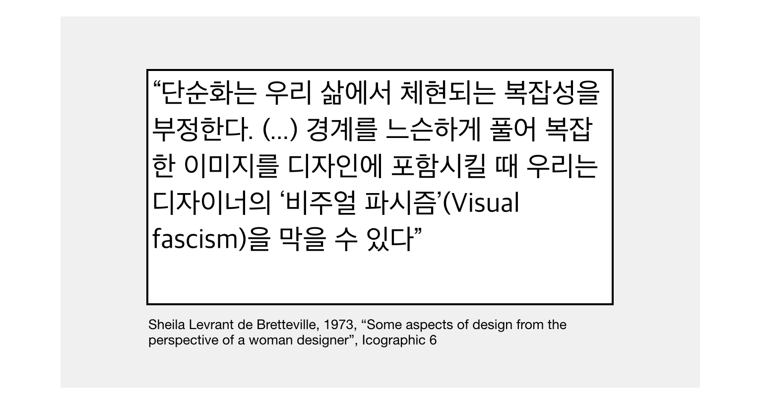 이와 관련되어 린다 노클린의 “왜 위대한 여성 미술가들이 존재하지 않았는가?”라는 말을 덧붙였습니다. 미술계가 어떤 방식으로 여성을 구조적으로 배제해왔는가에 대해 다시금 살펴볼 필요가 있다고 강조했습니다. 같은 맥락에서 디자인 역사에서도 그 많던 여성 디자이너는 어디로 사라졌는가를 반문할 수 있습니다.