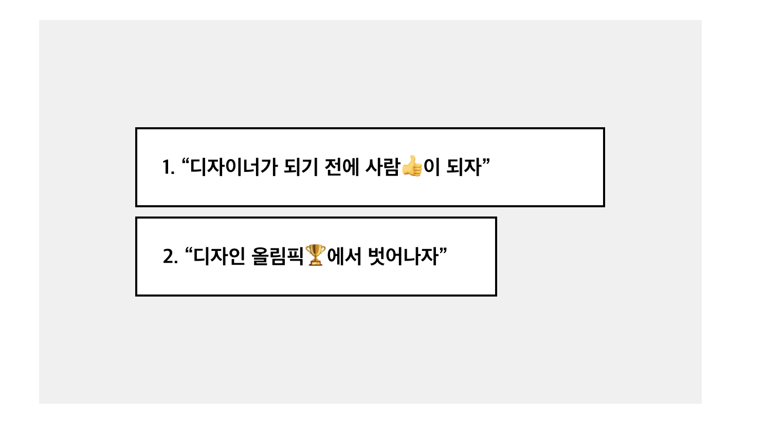 매일 디자인을 하고 있지만, 정작 무엇을 위해 디자인하는지 막연할 때가 많습니다. 디자이너에게 디자인은 단순히 일상과 분리된 개별 영역이 아닌, 함께 호흡하며 살아가는 유기적인 존재로 느껴지곤 합니다. ‘나’의 신념이 곧 ‘디자인’으로 표현할 수 있으며 ‘디자인’의 가치가 ‘나’에게 영향을 주기도 합니다.