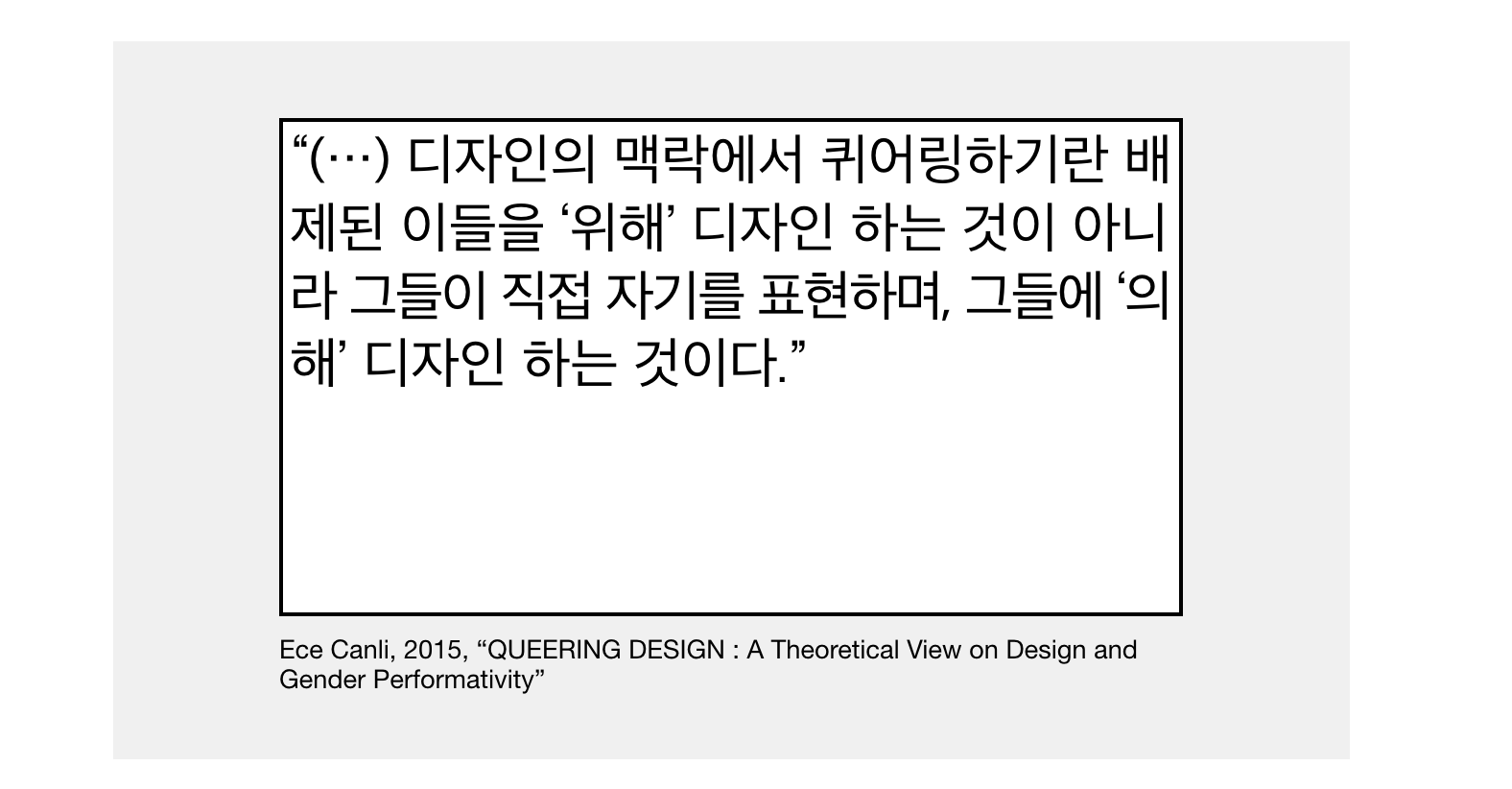 신인아 디자이너는 ‘앎’의 인식을 재정립하는 과정에서 더 나아가 디자인에 대해 다시 정의했습니다. 페미니즘 인식론에 기반한 디자인 담론, 디자인을 퀴어링하기 그리고 디자인을 탈식민화하기 등 여러 측면에서 디자인을 다시 조명했습니다. 특히 문제의 뿌리를 파악하고, 그 근원과 구조를 파악하는 데 집중했습니다.