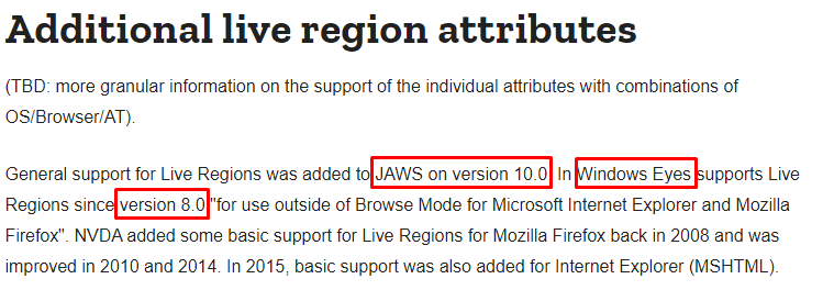 Ajax 등을 이용해 콘텐츠가 동적으로 변경되는 요소에 사용되는 aria-live 속성을 대표적으로 알아보면 스크린 리더기 JAWS(JAWS for Windows)는 version 10.0, Windows Eyes는 version 8.0부터 사용 가능합니다.