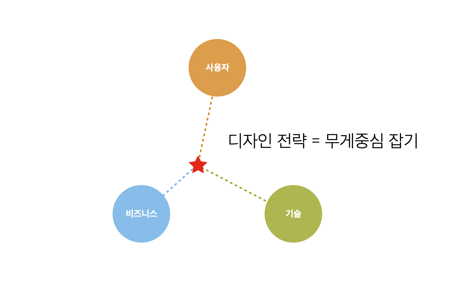 저는 이것을 '디자인 해법을 위한 무게중심 찾기'라고 표현합니다. 즉, 모든 디자인 과제는 비즈니스적 관점, 기술적 관점, 사용자의 관점이 존재하고, 프로젝트가 처한 상황과 참여 주체들의 이해관계에 따라 균형을 이루는 지점이 달라집니다. 때로는 비즈니스적으로 큰 이익이 없더라도 멀리 보면서 사용자의 문제 해결에 치중해야 할 때도 있고 예산의 제약, 시장 상황의 급박함에 따라 새로운 기술개발 없이 최소의 구현 난이도를 선택해야 할 수도 있습니다. 이와 같이 각각의 관점에서 어떻게 바라보느냐에 따라 무게 중심점은 달라질 수 있으며 디자인 해법도 달라질 수 있습니다. 그리고 이 과정은 각 주체 간의 협의에 의한 전략적인 선택의 과정이기도 합니다.