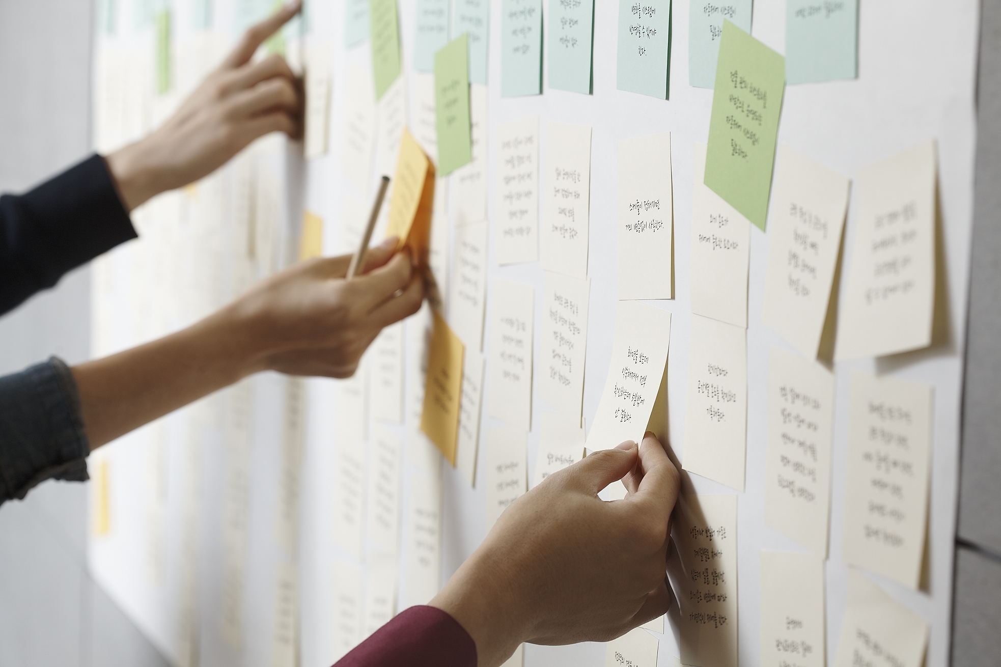 3. 제대로 이루어진다면, 포스트잇의 그룹 수만큼 다양한 관점을 얻을 수 있습니다. 그리고 서로 연관된 그룹을 묶어서 더 상위의 관점을 만들 수 있습니다. 이 과정에서 얻어진 다양한 관점만큼 바라보는 시야가 넓어지고 해법으로 연결되는 기회도 다양해집니다.
