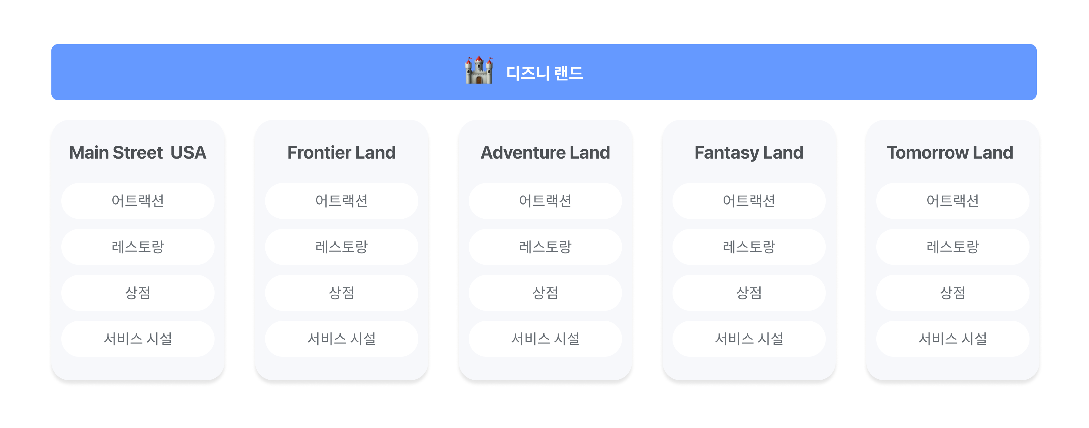 디즈니 랜드의 분류기준은 랜드(위치)입니다. 디즈니랜드가 보유한 테마를 가장 잘 나타낼 수 있는 기준인데요. 서비스의 특징에 따라 사용자의 여정, 서비스 방문 목적, 상품의 카테고리 등 다양한 분류 기준을 시도해볼 수 있습니다.