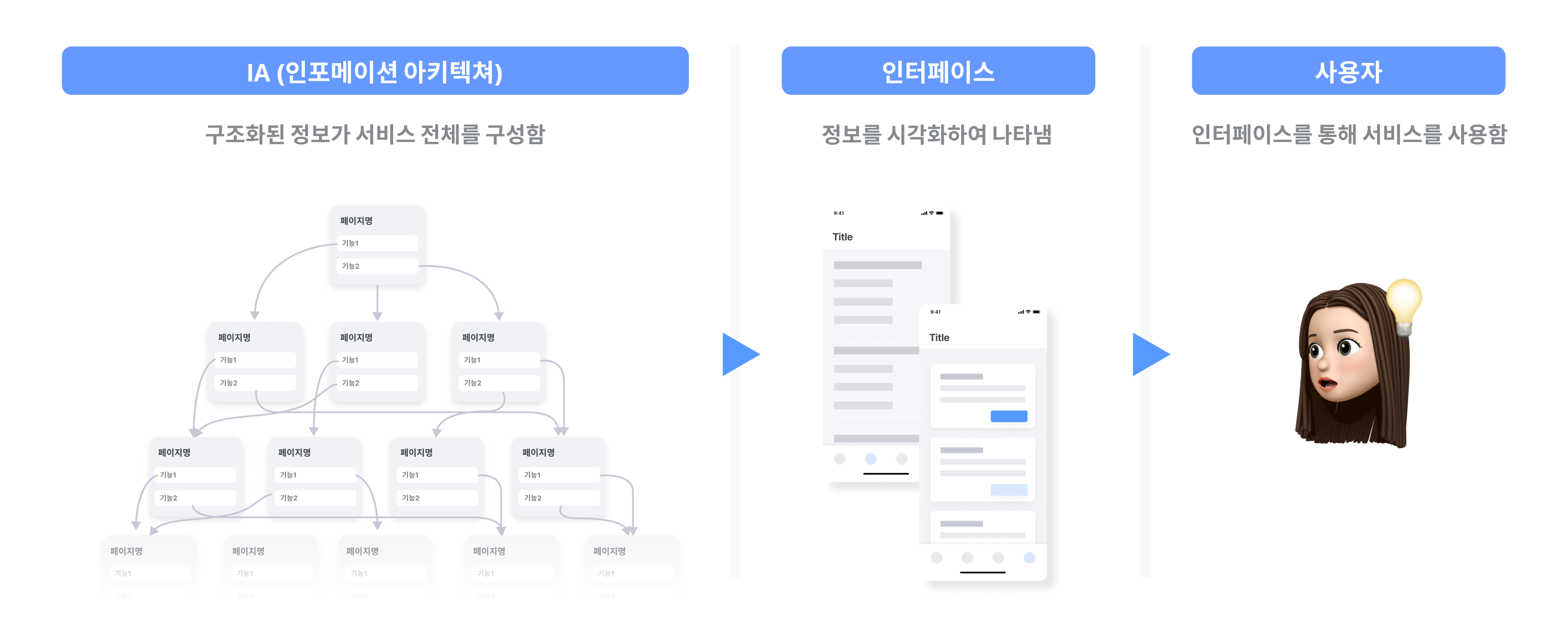 돌아와서, IA는 서비스 전체를 이루는 정보가 사용자에게 효과적으로 전달될 수 있도록 설계되고, 설계된 정보를 시각화한 UI를 통해 사용자에게 전달됩니다.