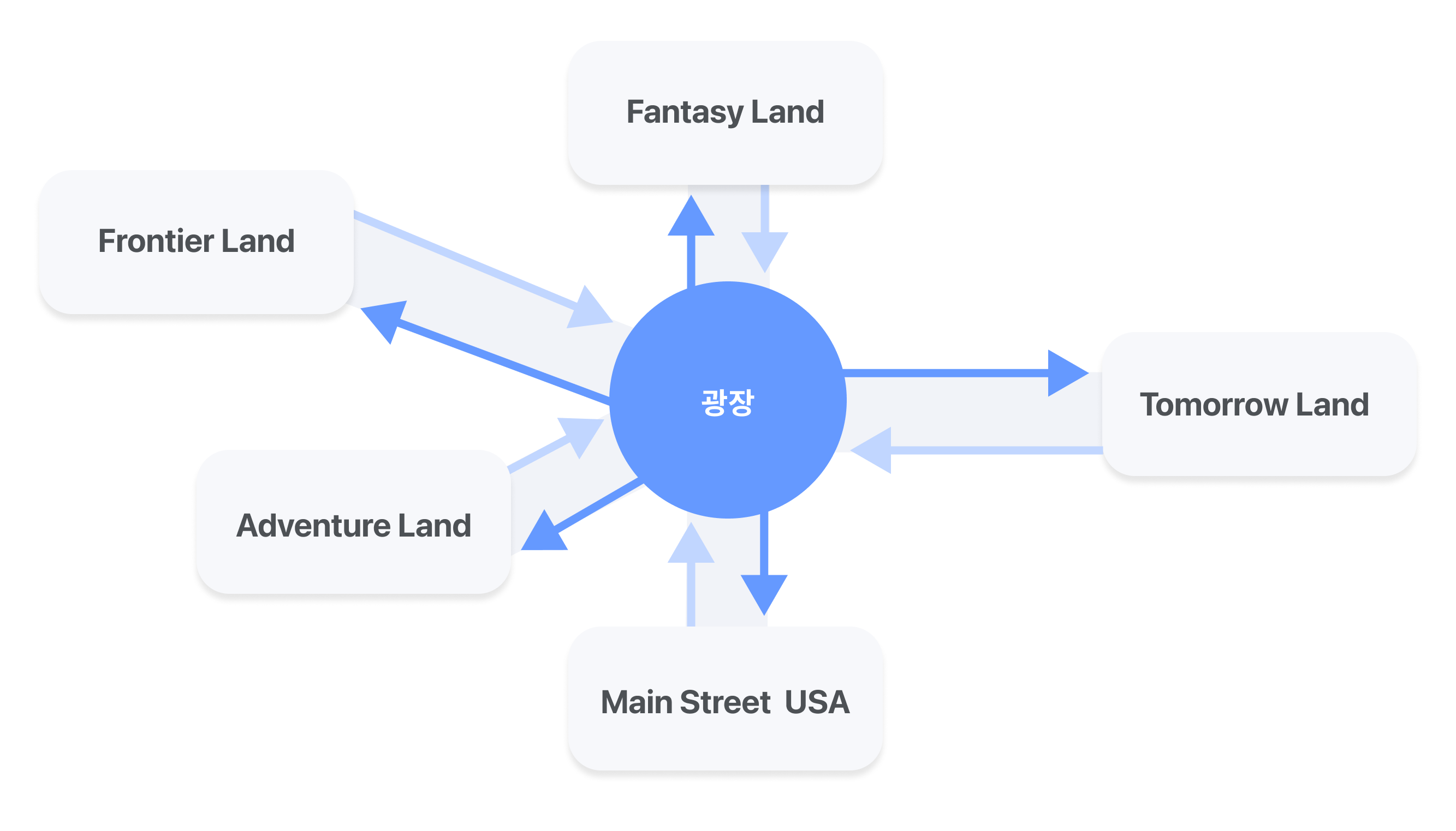 정보를 분류기준과 공통규칙으로 그룹화했다면, 이 그룹들을 연결해서 전체 구조를 만드는데요. 초기 디즈니랜드는 광장을 거쳐야지만 각각의 랜드로 들어갈 수 있는 구조를 만들었어요. 하나의 랜드에 들어가면 완벽하게 그 공간에만 집중할 수 있도록 의도했다고 하네요. 디즈니랜드처럼 플랫폼의 종류, 제공하는 기능, 전략 등에 맞는 정보의 구조를 선택해야 합니다.