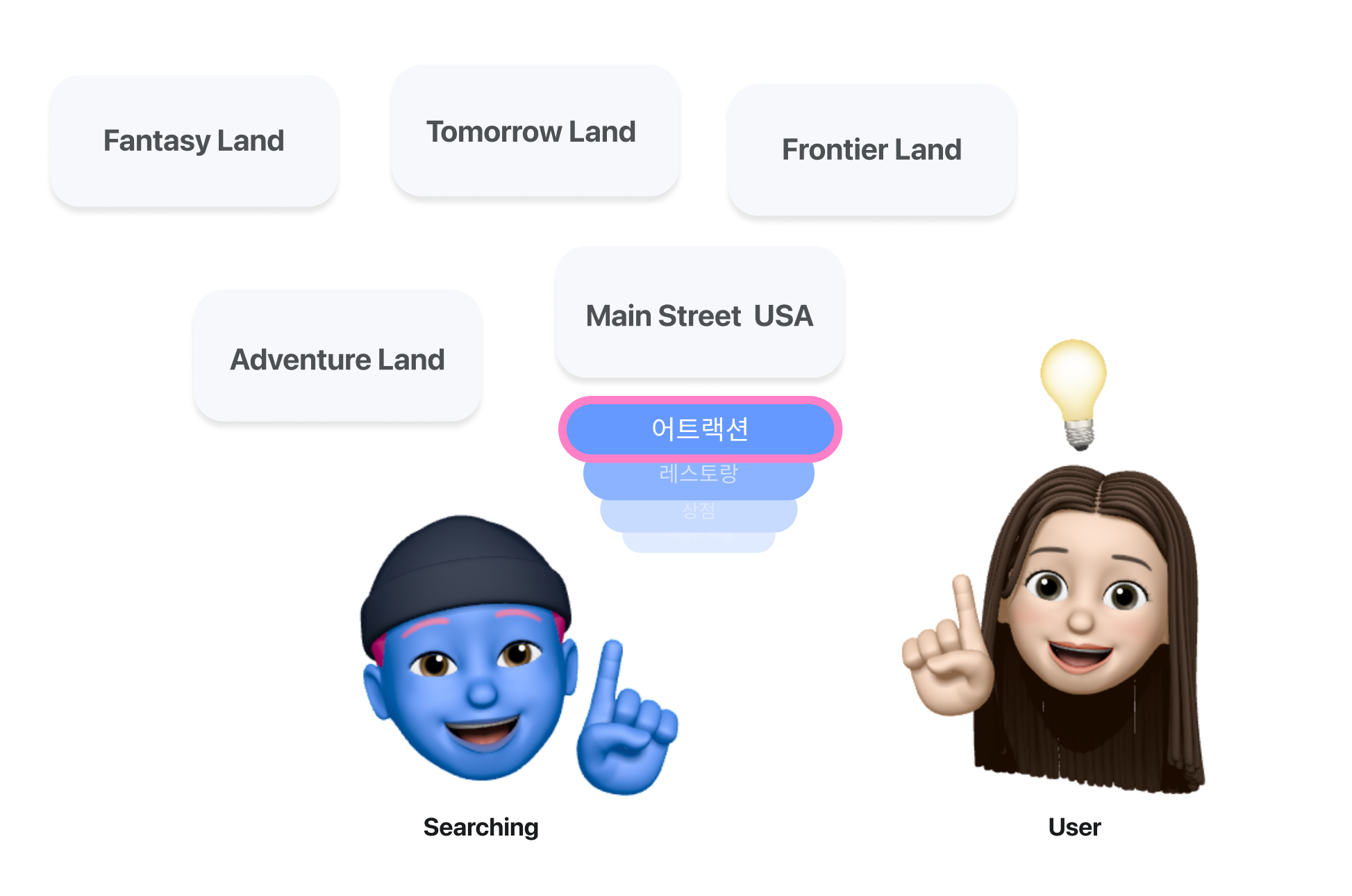 정보를 찾는 방법을 만들기 위해서는 검색 범위를 설정해야 합니다. 랜드 단위까지, 랜드 아래 어트랙션, 레스토랑 등의 레벨까지 혹은 하나의 개별 놀이기구까지 검색이 가능하게 할 건지 결정합니다. Seraching System은 단순히 키워드를 입력해서 정보를 찾게하는 것 이외에 필터나 정보에 빠르게 도달할 수 있게 만드는 다양한 기능들을 함께 생각해볼 수 있습니다.