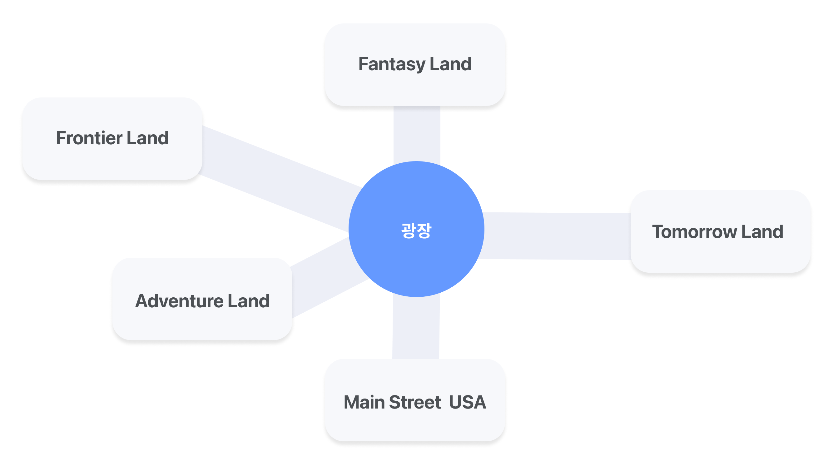 앞서 보았던 외부요소에서 얻은 정보를 토대로 구체화를 시작하는 단계입니다. 일관성 있게 분류된 정보는 사용자가 원하는 정보를 편하게 찾고, 쉽게 이해할 수 있도록 합니다. 또한 서비스가 사용자에게 전달해야 할 비즈니스 목표를 명확히 할 수 있습니다. 이를 위해서 서비스에 적합한 정보 분류기준을 찾고, 공통규칙을 만드는 과정이 필요합니다. 초기 디즈니랜드의 구조를 예시로 보겠습니다.