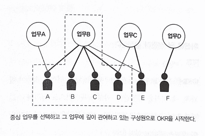 업무 B에 관여하고 있는 사람이 가장 많으므로 이 업무를 중심으로 OKR을 도입하기로 한다.