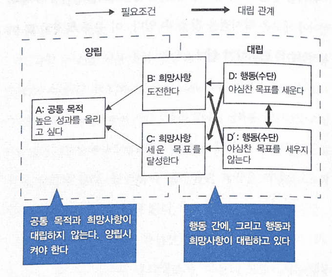 위의 도표에서는 행동 단계인 [D: 야심찬 목표를 세운다]와 [D’: 야심찬 목표를 세우지 않는다]가 대립하고 있다. 하지만 양쪽의 관점에서 공통 상위의 목적을 생각해보면 [A: 높은 성과를 올리고 싶다]라는 점에서는 일치한다.