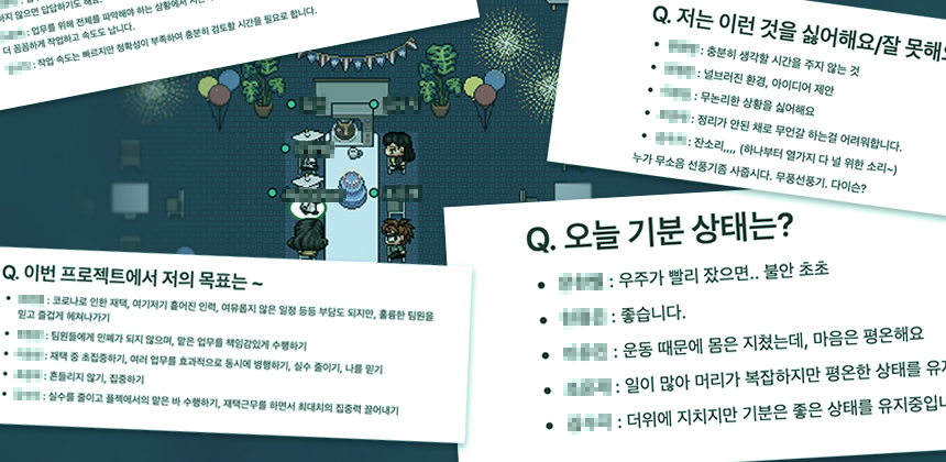코로나19 이후 재택과 원격 근무가 잦아지면서 매일 마주하던 동료의 얼굴을 보는 횟수가 줄었습니다. 개인 작업이라면 집중력을 더욱 발휘하여 퍼포먼스를 유지하겠지만, 업무 특성상 여러 사람과 팀으로 진행하기 때문에 나 혼자 집중한다고 되는 것이 아님을 깨닫는 데는 그리 오랜 시간이 걸리지 않았습니다. 무엇인가 더 필요했습니다.