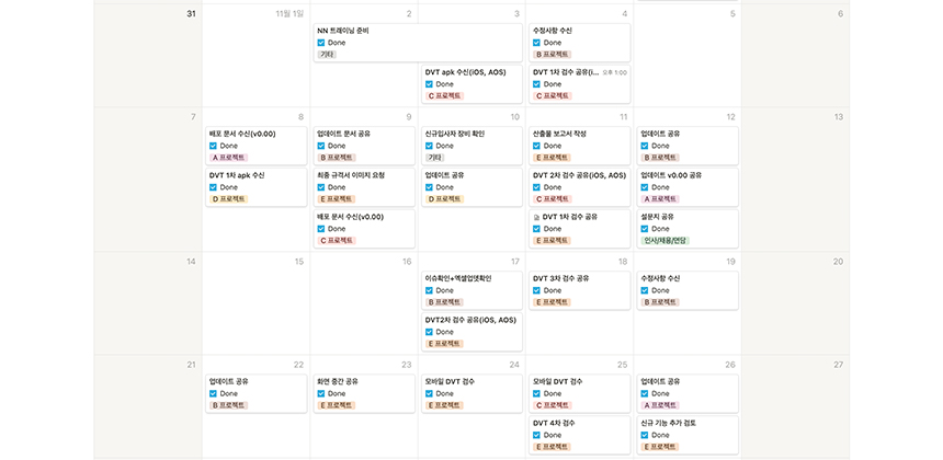구글 시트나 노션을 사용하면 조건부 서식이나 리스트 옵션을 쉽게 설정할 수 있습니다. 또한, 개발 f/u이나 유지보수를 하면서 적지 않은 양의 문서와 화면을 다루게 되는데, 이때도 재택근무 환경에서 팀원이 분담하고 있는 작업 범위와 상태를 즉각 확인하고 반영하는데 유용한 도구로 사용할 수 있습니다. 이것도 역시 팀 내의 모든 구성원이 언제든지 확인할 수 있도록 공유합니다.
