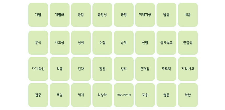 다년간 축적된 경험으로 프로스펙티브에서 무엇을 하는지는 사내에 거의 탬플릿화 되어있기 때문에 신입사원이나 경험이 많지 않은 사람도 큰 어려움 없이 이 과정을 준비하고 진행할 수 있었습니다. 오히려 새로운 질문이 추가되기도 했는데, 팀의 막내가 고안한 “나를 표현하는 단어”는 제시된 32개의 키워드 중에서 본인의 특성과 기질에 가까운 것을 고름으로써 보다 쉽게 자신에 대한 이야기를 풀어낼 수 있었습니다. 프로스펙티브를 통해 팀원의 장단점이나 능력, 개인적 목표, 성향과 상태 등을 파악해 두면 뒤에서 설명할 프로젝트 타임라인을 작성할 때 큰 빛을 발휘합니다.