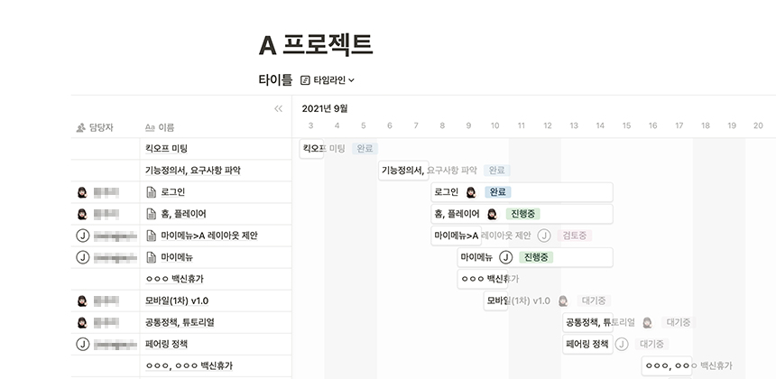 타임라인을 보면 업무의 흐름과 진행 상태를 수시로 확인할 수 있습니다. 액션 아이템뿐만 아니라 휴가, 수령한 파일, 외부 일정과 같은 내용을 리스트에 함께 적어 두면 업무에 영향을 미치는 간접 요인들도 다각도로 고려할 수 있습니다. 각 담당자가 맡은 업무와 기간을 살피면서 어느 시점에 더 많은 리소스가 필요한지 미리 확인하고 대비할 수 있습니다. 이는 결국 보다 세심한 업무 분장으로 이어질 수 있습니다.
