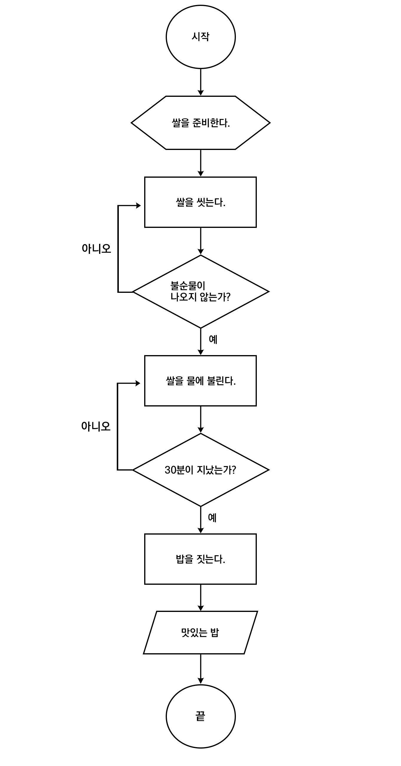 앞서 언급했듯이 순서도는 과정이 있는 모든 작업에 사용할 수 있습니다. 쉬운 예로 쌀을 씻는 과정을 순서도로 그려보며 방법을 확인해봅시다.