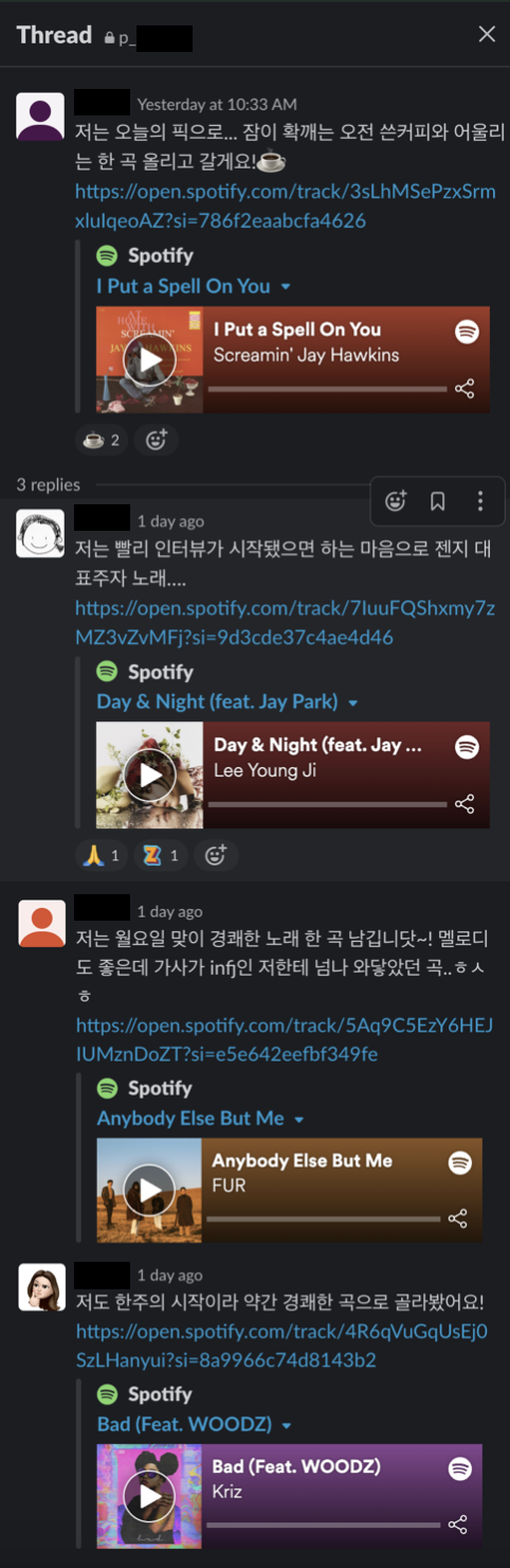 재택근무를 하면서 음악을 더 많이 듣게 되었어요. 재택근무를 하며 다양한 데일리 체크인을 시도해 보는데요, 요즘에는 마침 엔터테인먼트 산업 관련 프로젝트를 함께 하는 4명이서 하루를 시작할 때 음악 하나씩을 공유하고 있어요. 왜 공유하는지 간단하게 이유 나누기도 하고요.