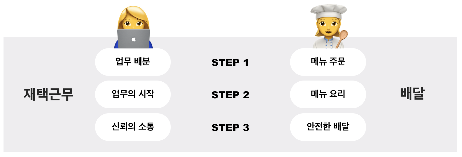 지금까지 재택근무에서 고군분투하는 팀원의 모습을 '주문하기 > 요리하기 > 배달하기'라는 프로세스에 비추어 이야기했습니다.