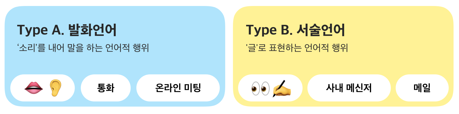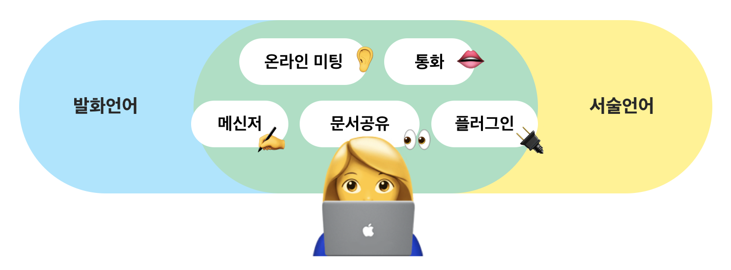 그렇다면 우리는 평소 어떤 언어를 사용하며 소통할까요? 재택근무 중 활용하는 주요 언어는 크게 '발화 언어'와 '서술 언어' 두 가지를 꼽을 수 있습니다.