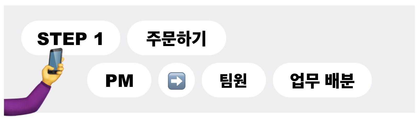 배달을 통한 한 끼 식사와 재택근무는 과연 어떤 포인트의 접점에서 맞닿을까요? 우선 배달 앱을 통해 음식을 주문하는 손님은 팀원에게 업무를 요청하는 PM과 닮아있습니다. 반면 주문 사항에 맞춰 음식을 준비하는 식당 주인은, PM에게 받은 업무를 성실히 수행하는 팀원이 되겠고요. 가장 핵심인 '배달' 과정에서는 재택근무 중 각자의 업무 상황을 소통하는 'PM-팀원'의 모습을 떠올릴 수 있습니다. 배달 과정에서 '맛있는 한 끼 식사'라는 공통된 목표를 향해 각자의 자리에서 고군분투하듯, 재택근무에선 '더 맛있는 구성의 서비스 디자인'을 위해 PM과 팀원이 끊임없이 소통합니다.